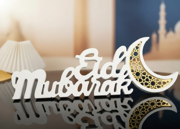 Eid Mubarak Wooden Letter Sign decoration in gold and white with crescent moon.